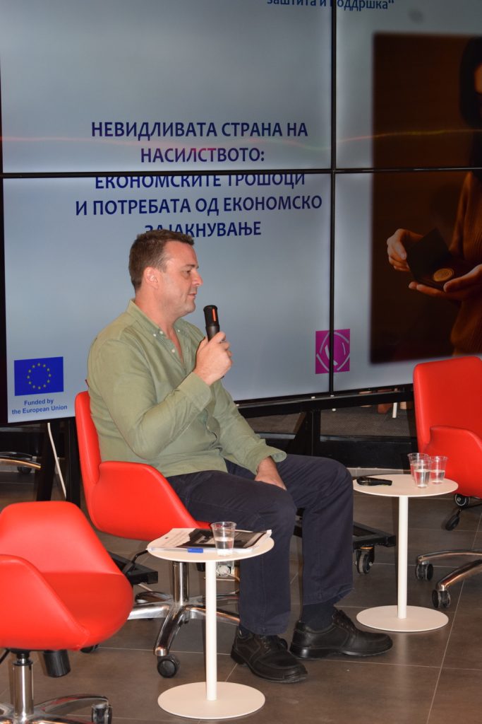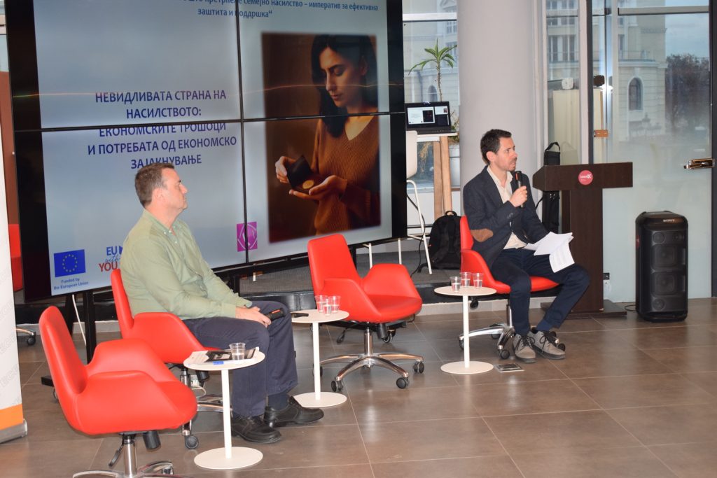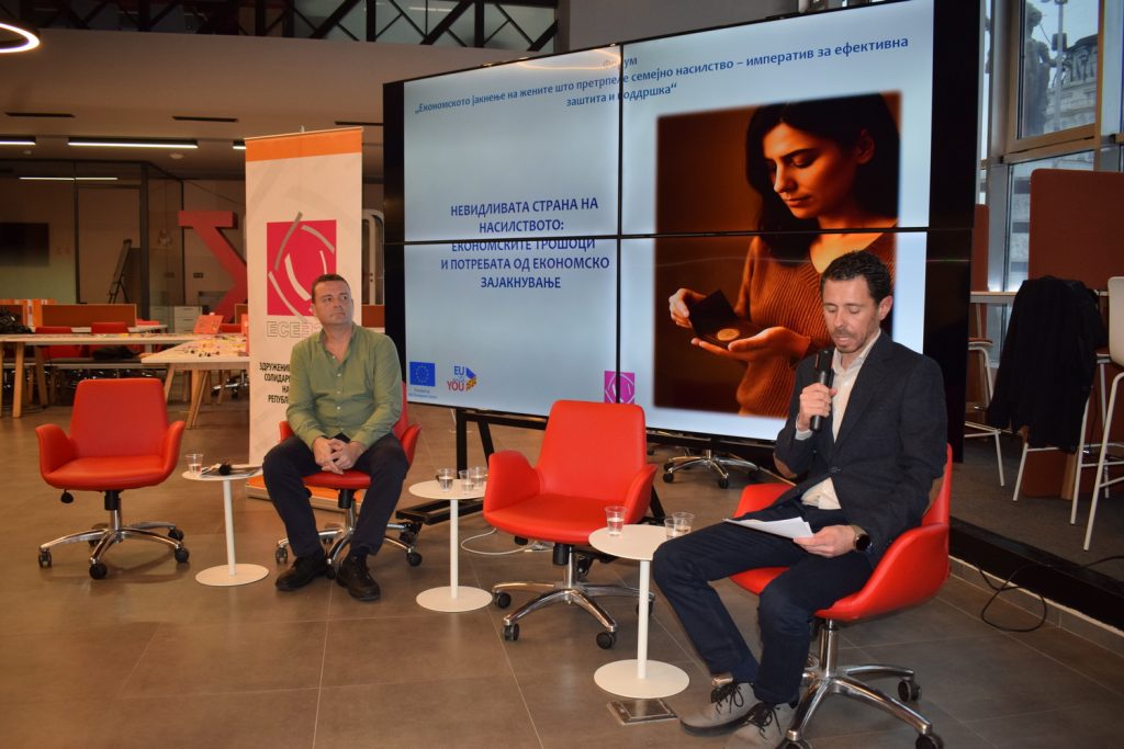 Во рамки на првиот панел, фокусот беше ставен на потребата од економско јакнење на жените, со особено внимание на неповолната финансиска состојба во која тие се наоѓаат по разводот на бракот или разделбата. За таа цел беа презентирани главните наоди од анализите што ЕСЕ ги спроведува со жени кои претрпеле семејно насилство, вклучително и високите трошоци со кои се соочуваат како последица од насилството, како и проблемот со недоволната и/или неплаќањето на судски досудената издршка за децата, што дополнително ја продлабочува нивната економска ранливост.